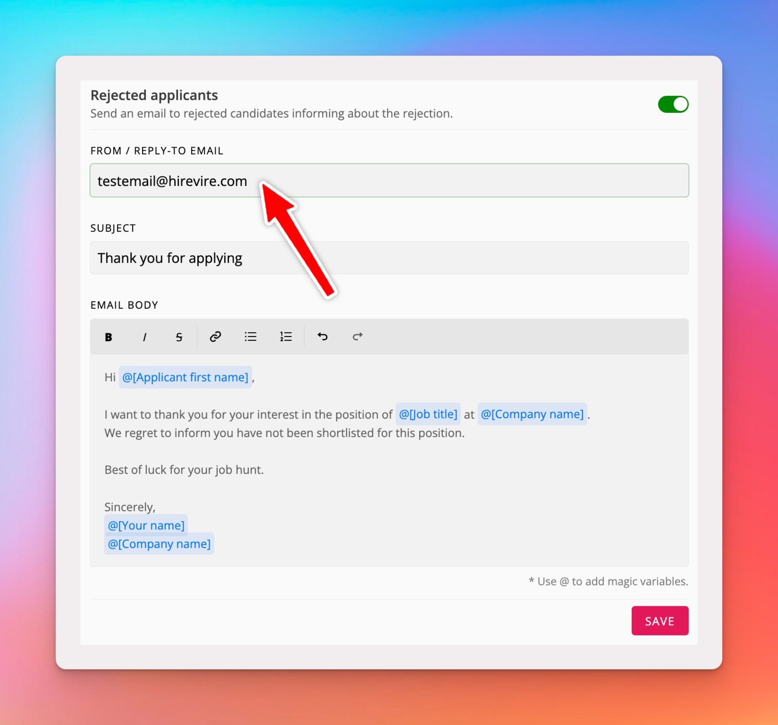 On the application details screen - now when you hit the shortlist / reject button you'll see a confirmation window asking whether you'd like to send out the shortlist or rejection email as well and you'll see this address being used there as well.