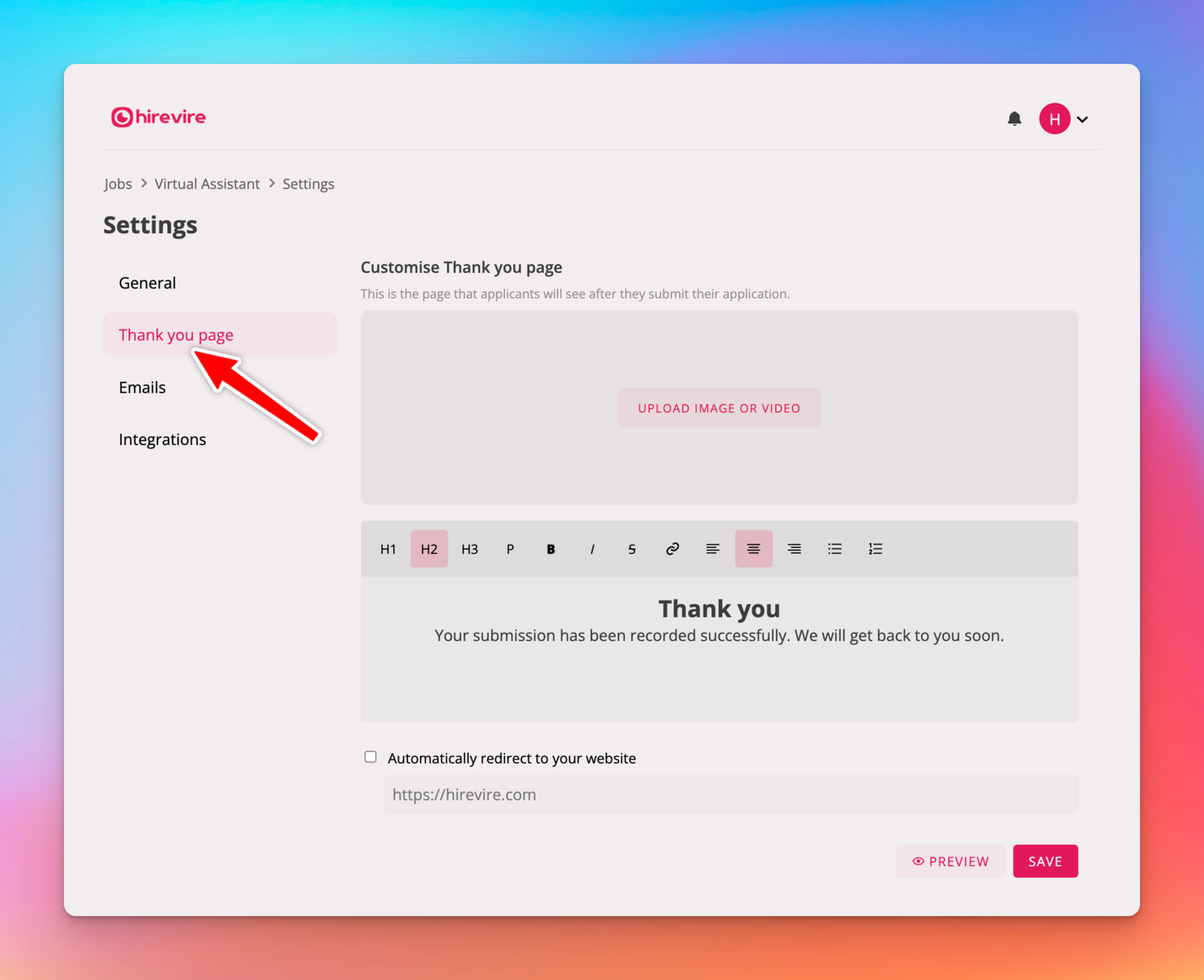 Check automatic redirection and type in a URL to redirect an applicant from the thank you page to the page of your choice. The redirect happens after 8 seconds of the thank you page being loaded.