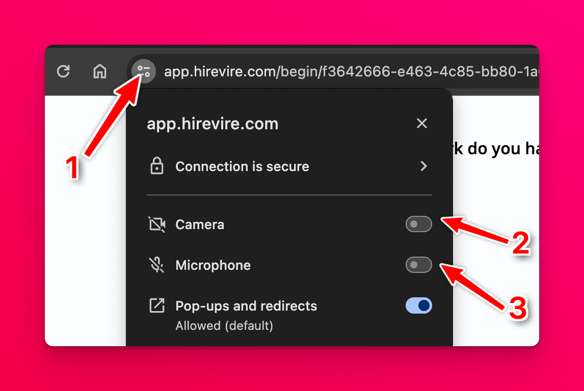 If you've hit "Don't Allow" by mistake - refreshing the page will show the same popup again. If you've pressed "Never for This Website" by mistake or receive the "Please enable camera & microphone permissions" message while submitting your answer, follow these steps.