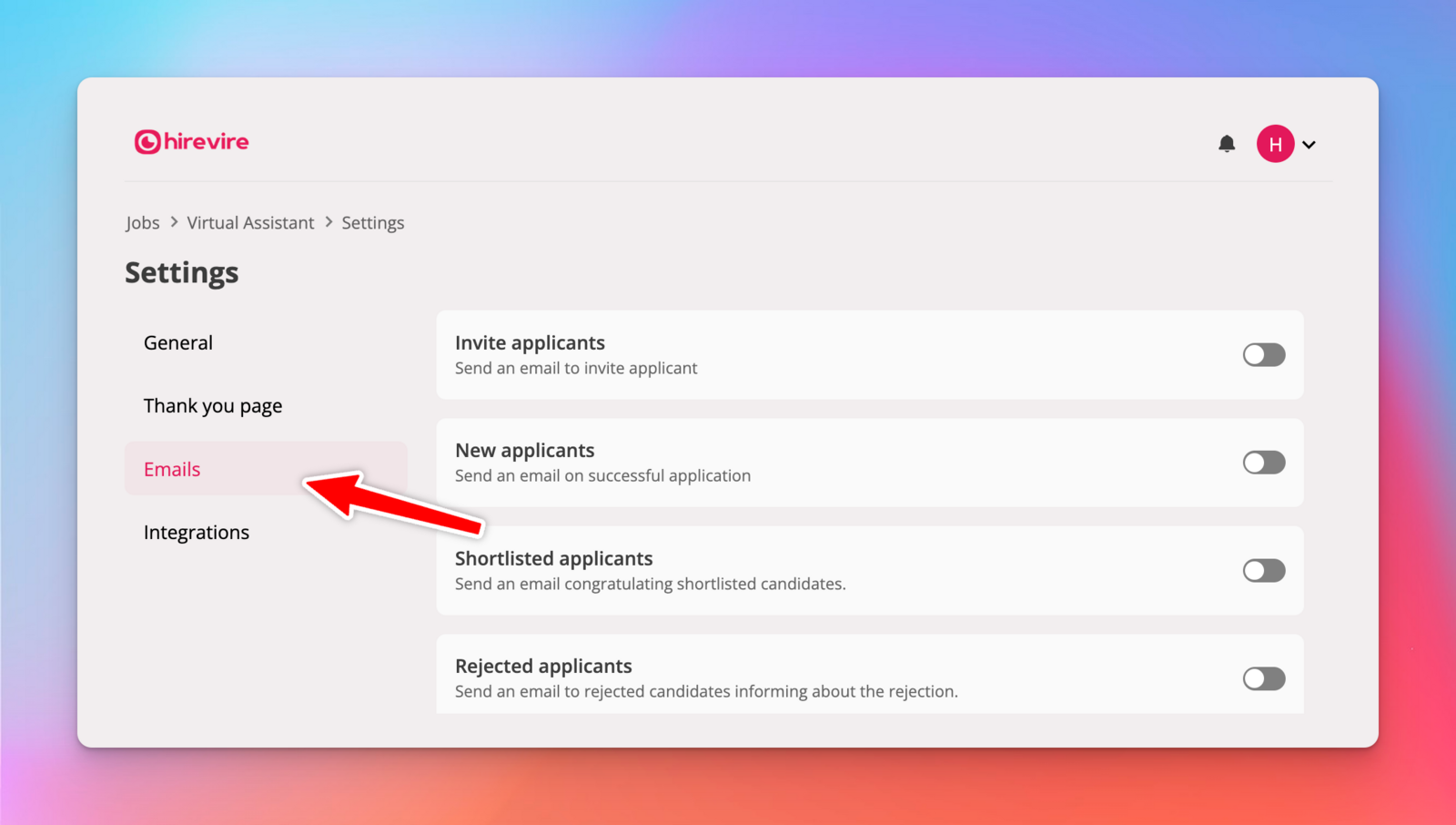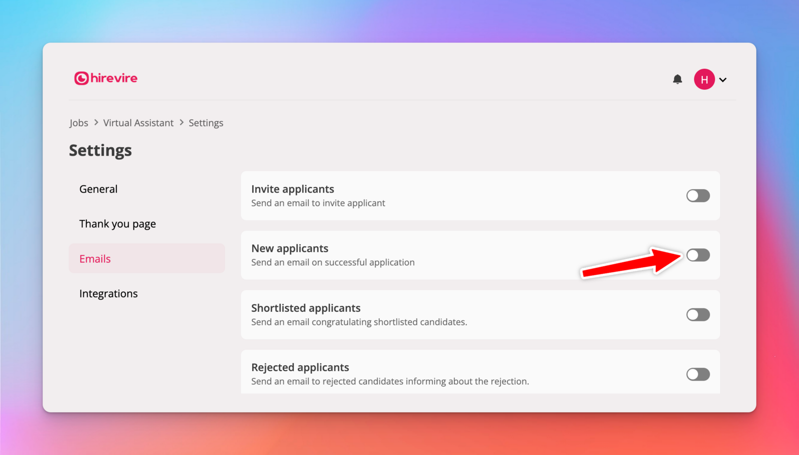 Scroll down and enable the New Applicants email template by turning the toggle switch to the ON position.