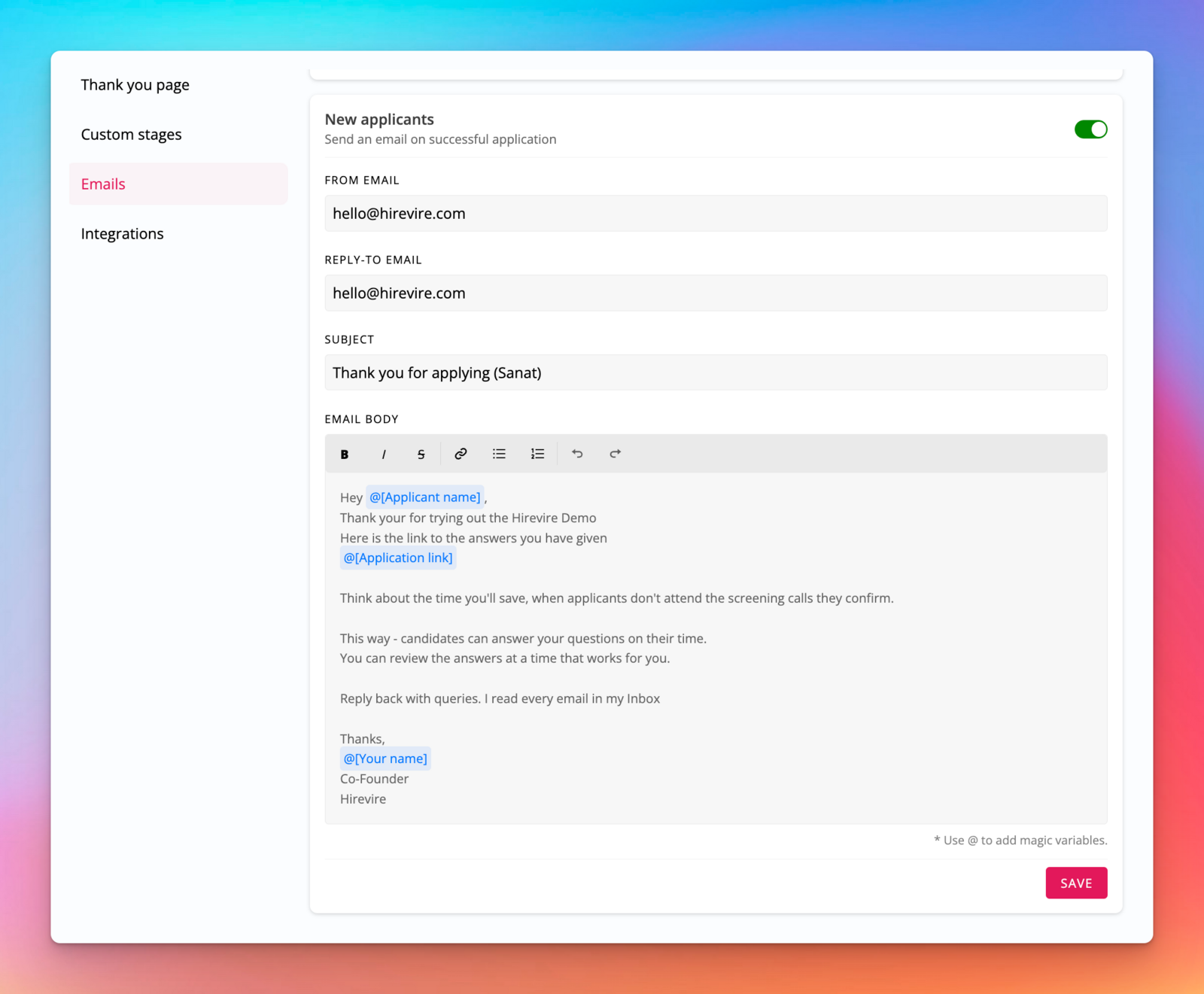 You can use magic variables in the email template by using an "@" sign Common magic variables include Applicant First Name, Applicant Full Name, Company Name, etc. A full list of available magic variables will be shown when you type "@".