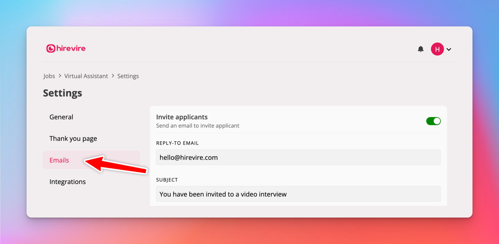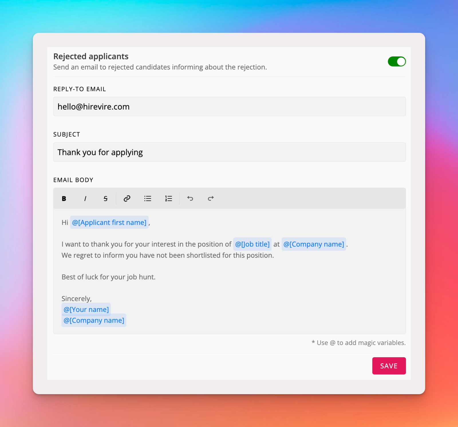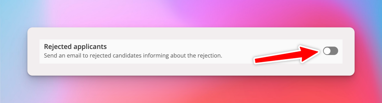 Scroll down and enable the Rejected Applicant email template by turning the toggle switch to the ON position.