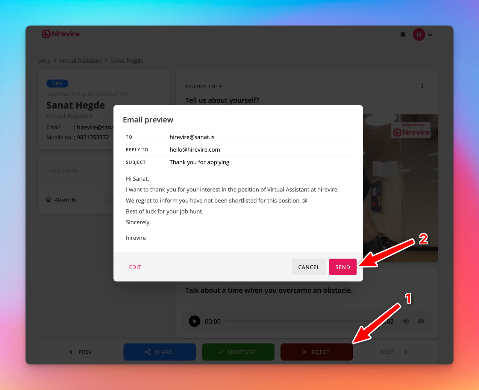 When you hit Send - the reject email is sent. Cancel on this window cancels the candidate rejection. "Edit" takes you to the Email templates section of the jobs details to edit or turn off the email.